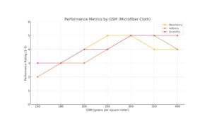 Microfiber’s functional attributes change significantly as GSM increases. Below is a performance comparison across 150–400 GSM cloths across 3 criteria:
